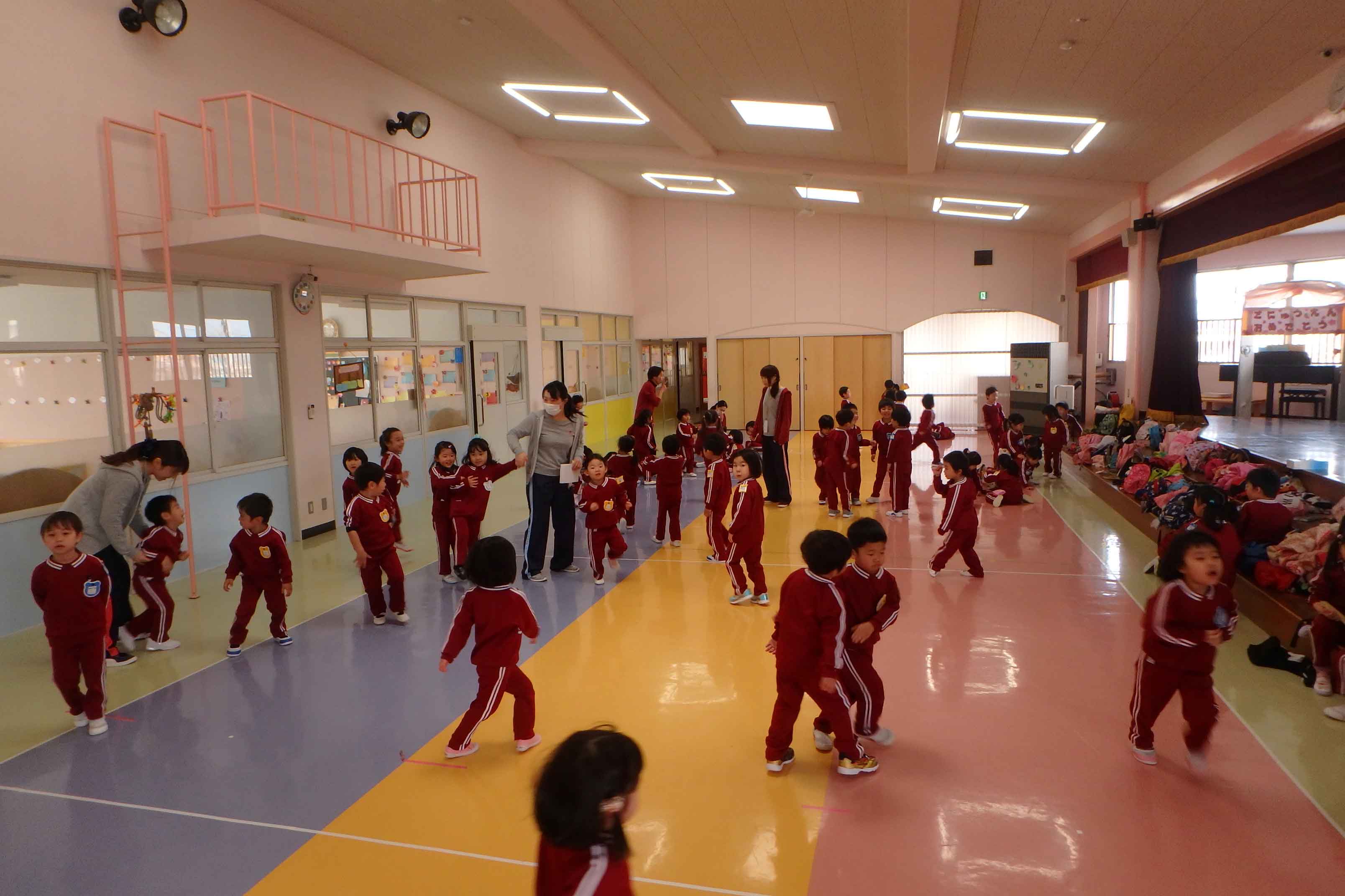 そしてまた、実際の保育において、当園では幼児期における音感教育を重視し、取り入れています。音楽と体育を併せた「音体リズム遊び」を通し、「たくましさ、高度なリズム感、体力」などを身につけ美しい演奏、演技によって豊かな情操を養うことにねらいをもって音体指導を取り入れております。