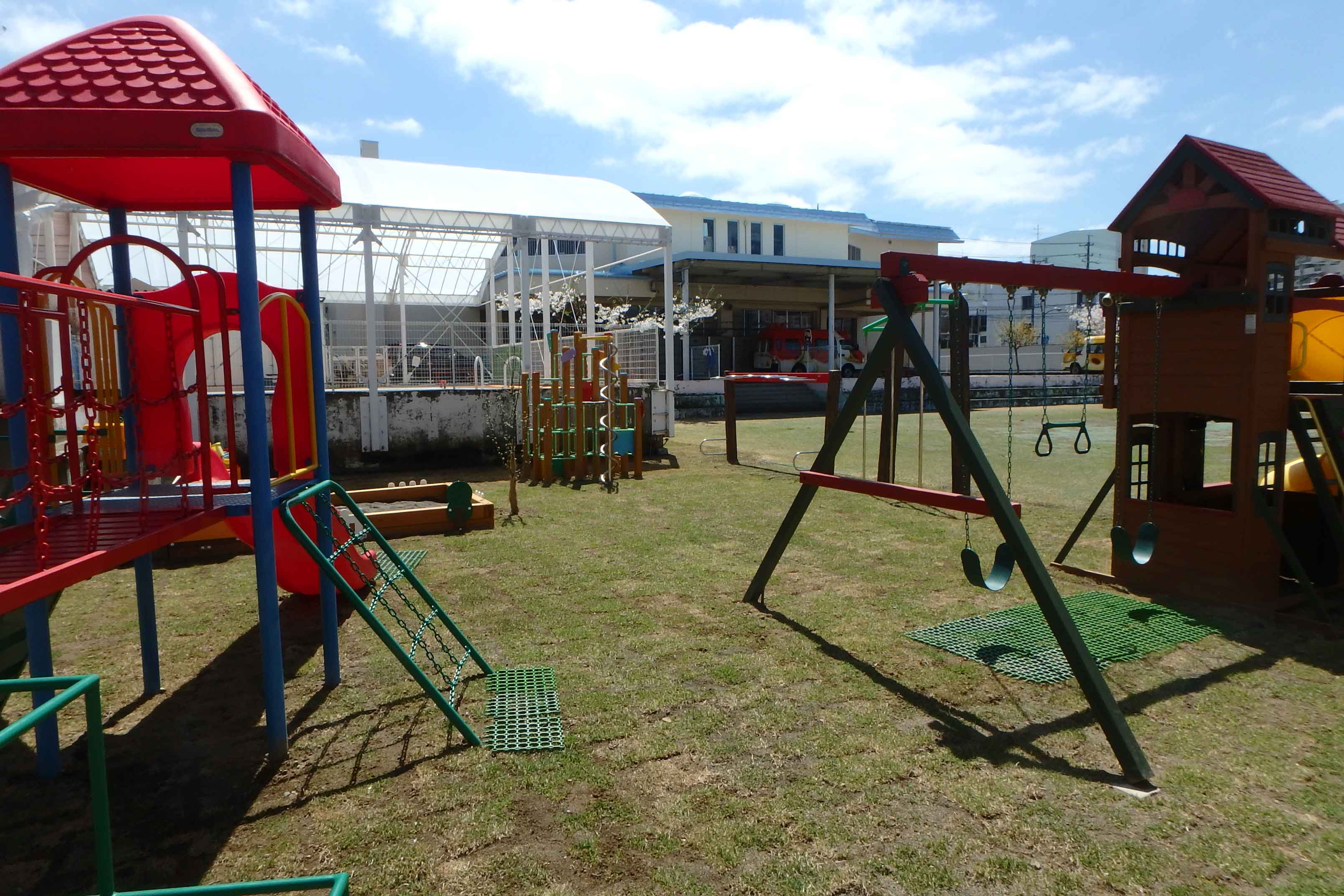 園庭にある大きな桜の木々を中心に花と緑があるマリアこども園。いつも笑顔の先生、明るく、広い園舎、たのしい遊具が、子どもたちを見守っています。